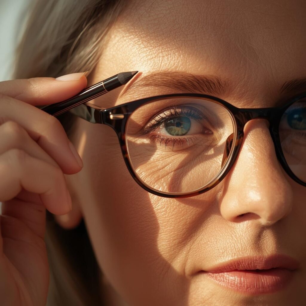 Your brows frame your face and glasses. Well-shaped, filled-in brows help balance the frame and enhance your features. Use a brow pencil or powder for a natural look.
